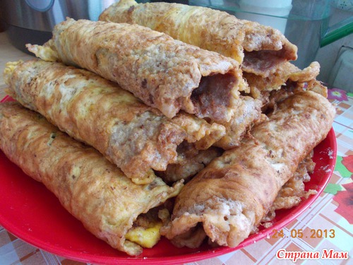 готовую бризольку сразу с сковороды заворачиваем, чтобы сторона с яйцом была снаружи, кто то кладет начинку, я нет, готовлю и для детей