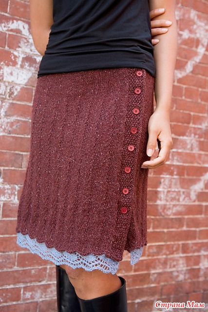 Наберите 13 п., используя спицы большего размера и нить КЦ. Вяжите узор по описанию (см. выше), пока работа не достигнет в длину размера окружности подола юбки. Оставив петли на спице (или переместив их на держатель), заблокируйте оборку и перепроверьте размер. Подгоните длину, если нужно, затем закройте все петли. Швейной иглой пришейте оборку под подол юбки так, чтобы оборка была видна.
