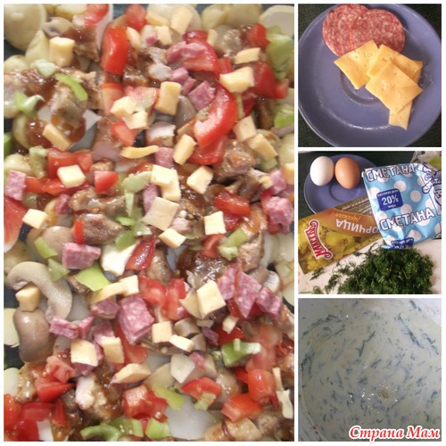 ту да же отправился сыр и колбаса копченая и сделала заливку из сметаны, горчицы, яиц, укропа