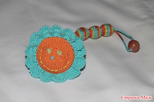 Добрый вечер, дорогие СМамочки! Сегодня за полдня связала вот такую погремушку "Радостный цветок". Она уже от меня уехала, завтра её подарят малышке. Надеюсь, малышке понравится мой "Цветочек", тем более, что его можно одеть на ручку, подвесить на кроватку/коляску либо играть как с обычной погремушкой. Серединка цветка приятно шумит.