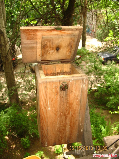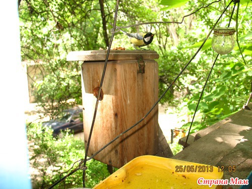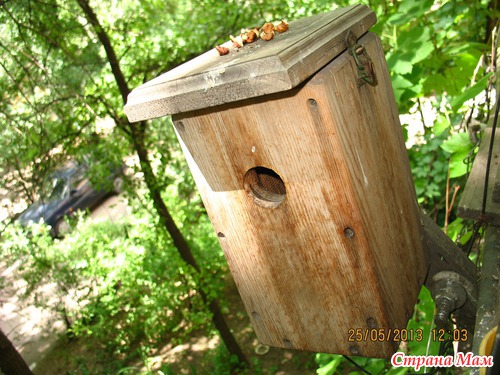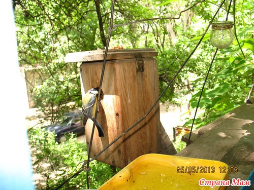 Пять лет назад я заказала мастеру сделать домик для синичек. Он напоминает скворечник, но меньших размеров. Конструкцию нашла в интернете, и вот через время мастер принес этот чудо-домик. От себя он добавил замочек на крышку, чтобы она была откидная (за птенцами наблюдать). Мы повесили домик за балконом и 5 лет упорно ждали, когда же его заселят. И вот этой весной - О! Чудо! у нас появились квартиранты! А теперь фотоотчет!