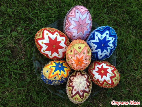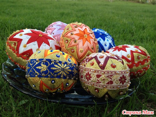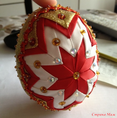 Материал: атласные ленты, стразы, бисер, пенопластовая заготовка формы яйца.