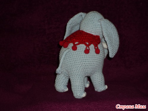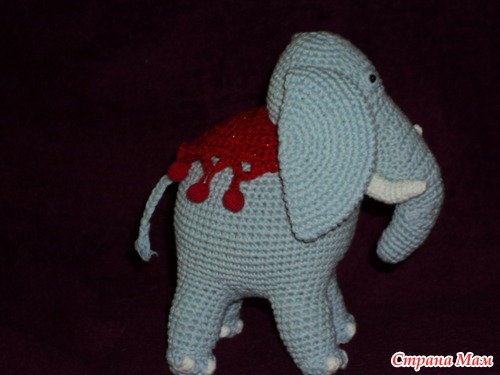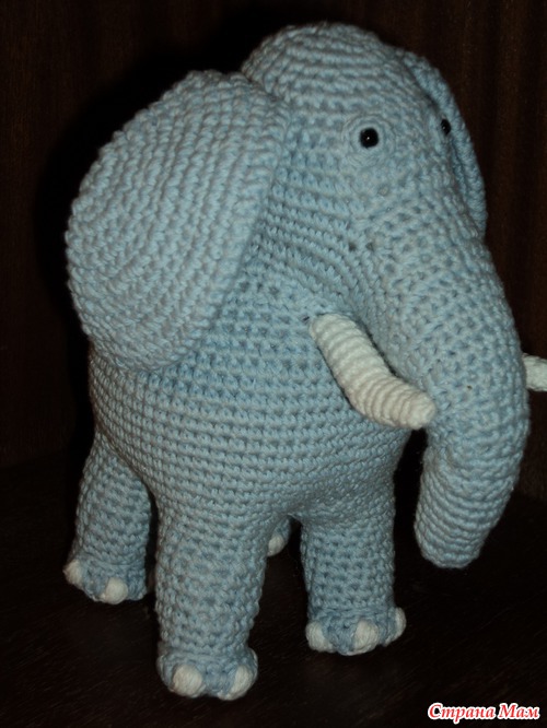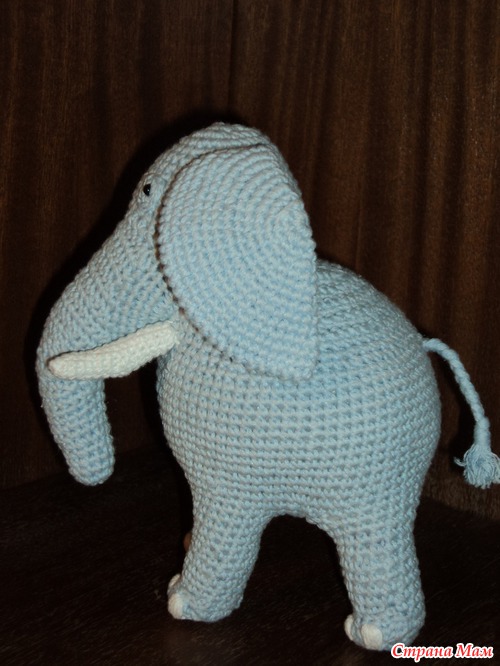 Вязала без схем и описаний, начала с ног и закончила кончиком хобота. Кажется, ещё будет заказ на розового... Готовлю нитки. Привет всем заглянувшим!