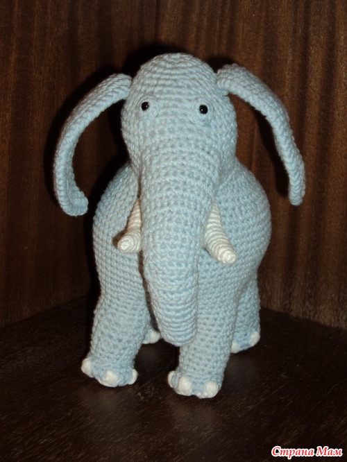 Вязала без схем и описаний, начала с ног и закончила кончиком хобота. Кажется, ещё будет заказ на розового... Готовлю нитки. Привет всем заглянувшим!
