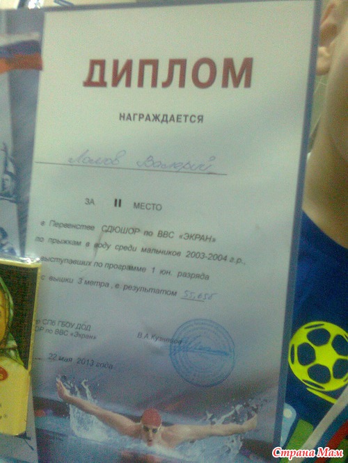 22 мая Валера занял 2-е место в первенстве СДЮШОР по ВВС ’’ЭКРАН’’ по прыжкам в воду среди мальчиков 2003-2004 г. р. Выступающих по программе 1 юн. разряда с вышки 3 метра!!!