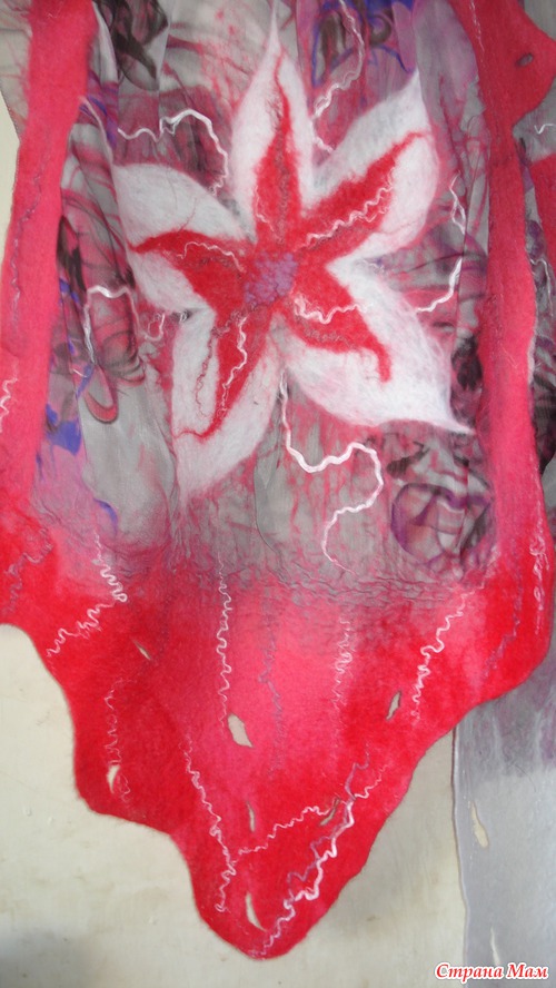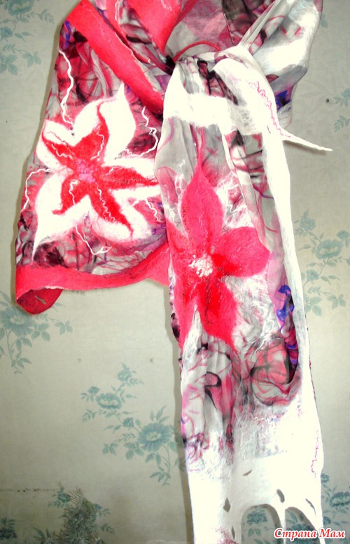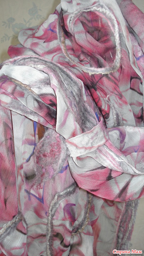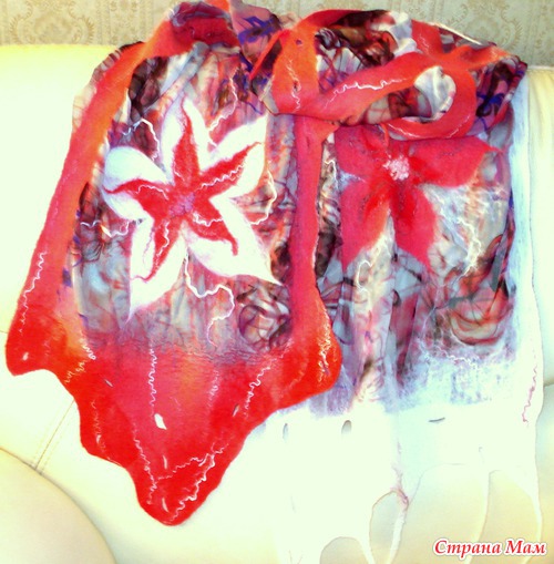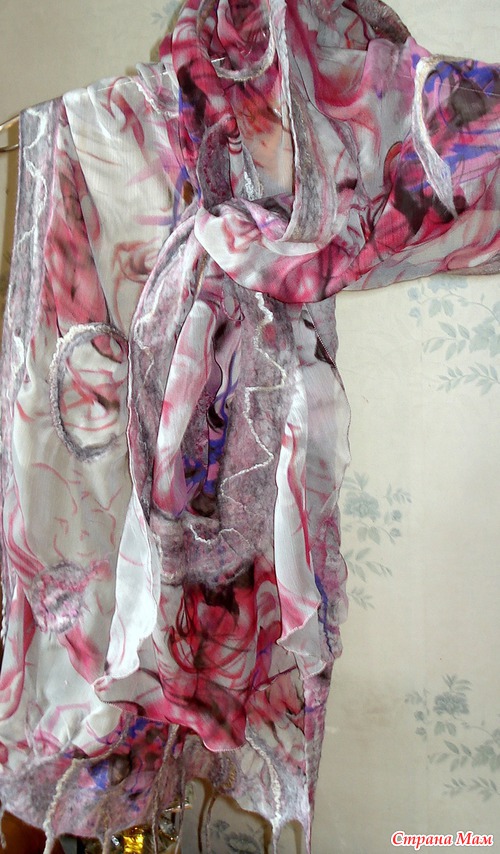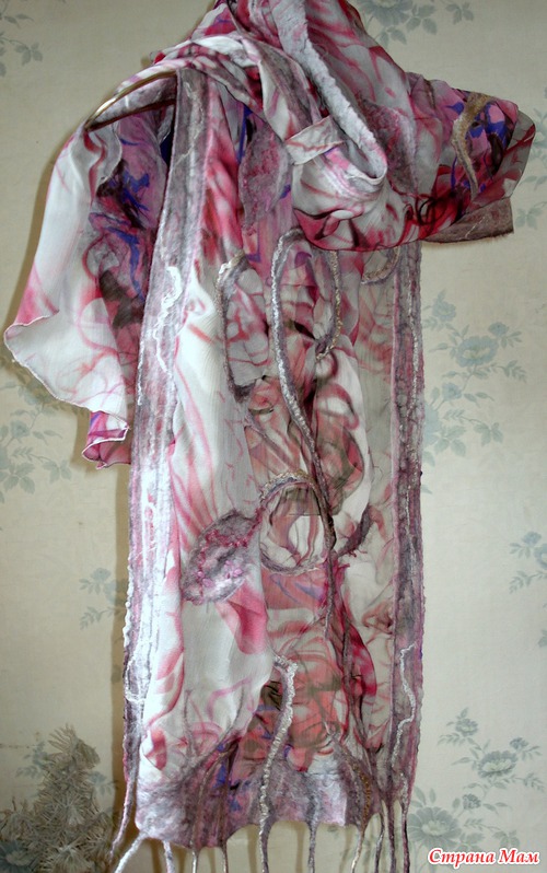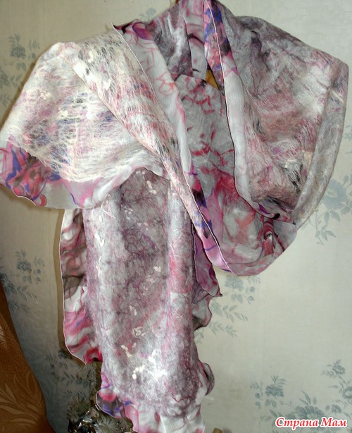 Из 2-х метров шелковой ткани шириной 150см сделала три палантина. Этот метод валяния(приваливание натуральной шерсти к ткани)называется-НУНОФЕЛТИНГ. Один метод..., шелк один на всех палантинах, а палантины такие разные! Вообще я специализируюсь по валяным дамашним тапочкам из натуральной шерсти(мои темы по тапкам есть на сайте), а палантины только осваиваю. Их у меня всего несколько штук.