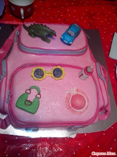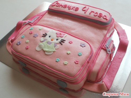 Торт Ранец для девочки на 4 годика. Внутри апельсиновый бисквит, масляный крем со сгущённым молоком, орешки.
