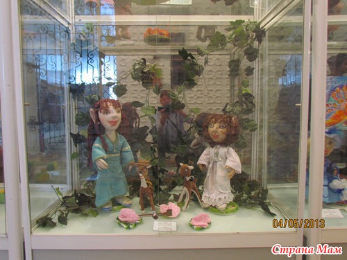 Для меня конечно персональная выставка -это что-то невообразимое -до сих пор не верю, что это произошло со мной)))) На открытии выставки я почувствовала себя Золушкой, которая много и тяжело работала и вдруг появляется Фея, взмах палочкой и я оказываюсь на балу, где мой труд оценен и все вдруг смотрят на меня совсем другими глазами. Приглашаю немножко прогуляться со мной по выставке))) Многие фотографии, когда их фотографировали общим планом, были засвечены из-за витрин, при близкой фотосъемке отдельных кукол -получилось замечательно, но тогда не видно композиции, деталей, антуража так сказать.