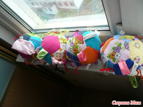 Нашилось: лоскутки разные-флис, х\б, джинс, трикотаж с разными интересными рисунками (детка наощупь познаёт мир вокруг себя: мягкое, лохматенькое, нежное, жесткое, грубое...)