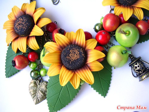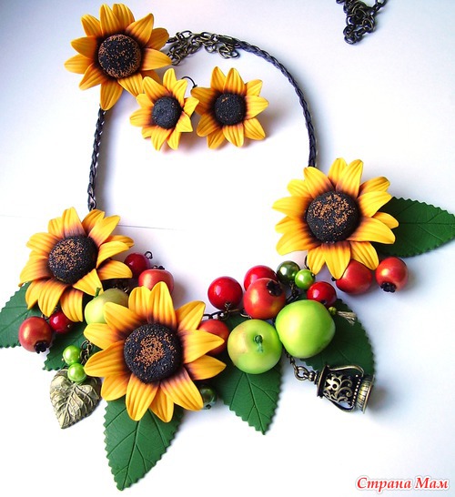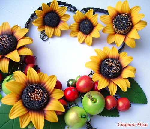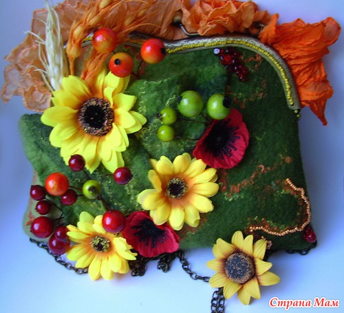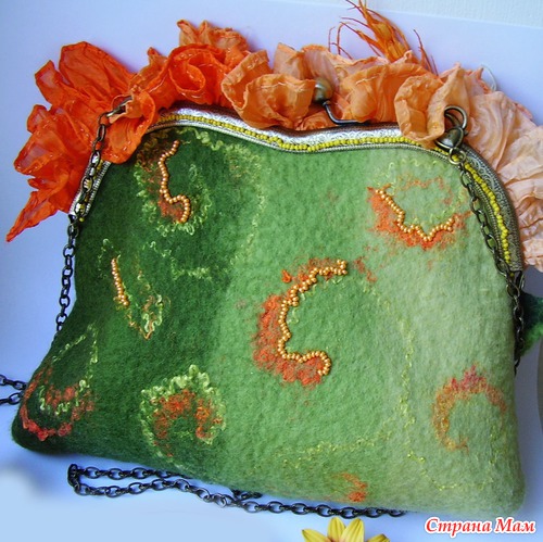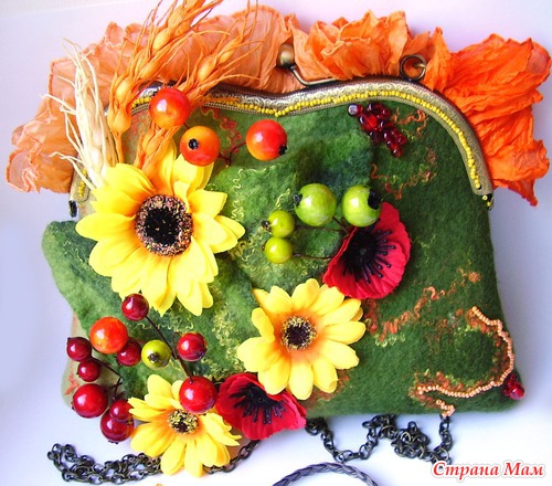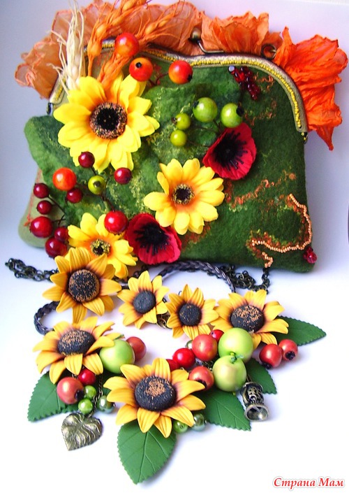 Итак, хочу презентовать Вам новую работу: украшения выполнены из любой мною полимерной глины (ну куда же без нее), а сумочка - мое первое валяние.