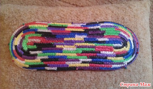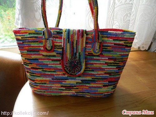 Очень интересная сумочка и аккуратно связана.Молодчинка.Я этим вязанием из пакетов заболела давно.Много связала сумочек и из разного вида пакетов.И пришла к выводу что лучше и легче вязать из пакетов маек однотонных и самых больших.Всё таки они тоньше.эластичнее и изделие смотрится очень и очень прилично.