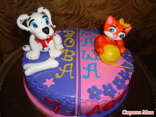 Торт для двойняшек: мальчика и девочки. Ванильный бисквит. Пломбирный крем с персиками. Полуганаш. Вес 2,7кг. На фото он очень яркий, на самом деле цвета не такие ядовитые.