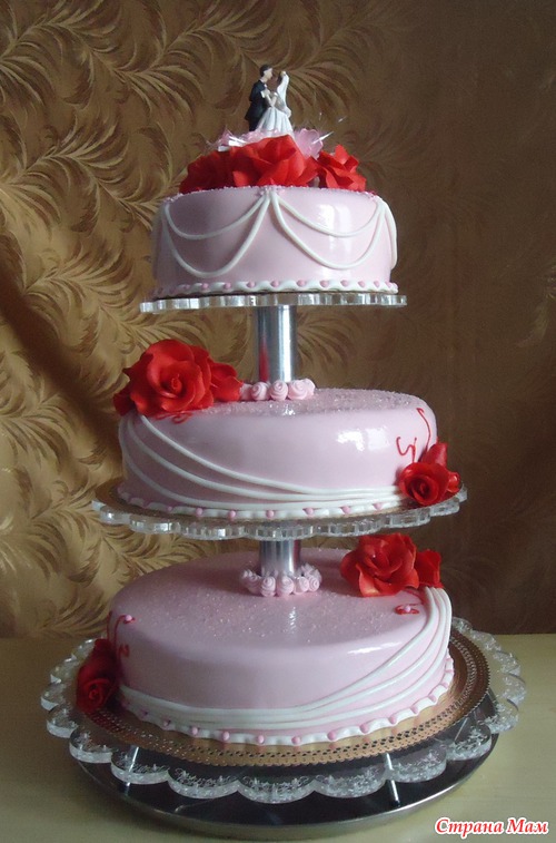 Свадебный. Низ-шоколад на кипятке. Творожно-йогуртовое суфле с вишней, настоянной на коньяке. Ганаш. Вес 4,5 кгСередина-ванильный шифон. Йогуртовое суфле с персиками. Полуганаш. Вес 3,5 кг. Верх 3 шоколада.