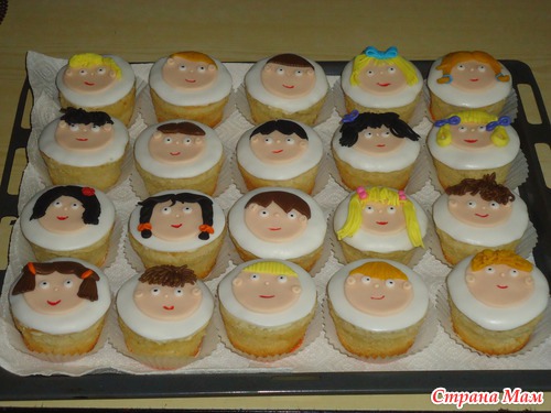 Капкейки на выпускной в 4 классе. С рожицами:ванильные капкейки с пломбирным кремом с фруктами. Полуганаш. С выпускными шапочками и надписью 11-4=7(забыли сфоткать, эту мне уже родители прислали)-шоколадные капкейки с шоколадным кремом.