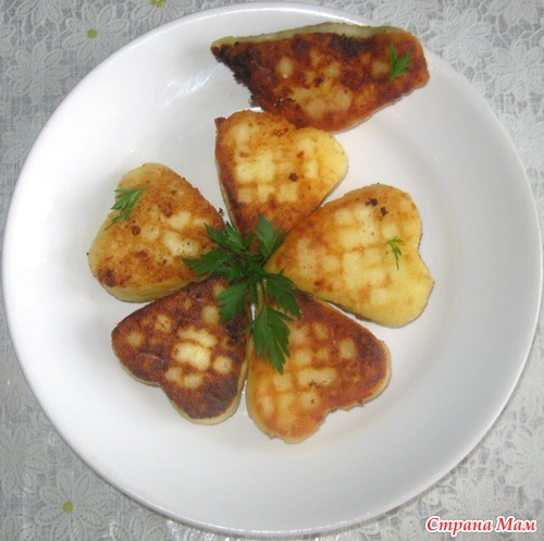 Приготовив смесь для сырников, взяла формочки для печения в виде сердечка и птички. Формировала из смеси шарик, формой выдавливала фигурку, затем готовую фигурку обваливала в муке и обжаривала на сковородке на подсолнечном масле. В итоге получился вот такой завтрак.