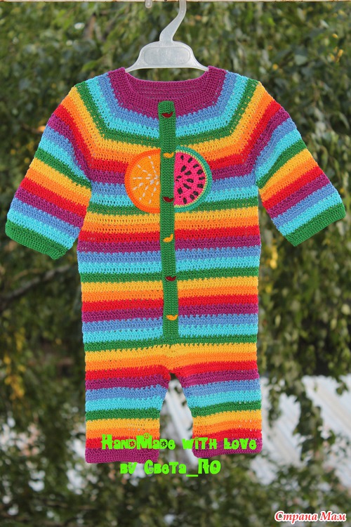 Вот такой комбинезончик получился у меня для одного малыша... Перебирала множество вариантов его решения... Но как увидела в магазине эти пуговки-арбузки - так сразу мои мытарства кончились - в голове мгновенно возник нужный образ...