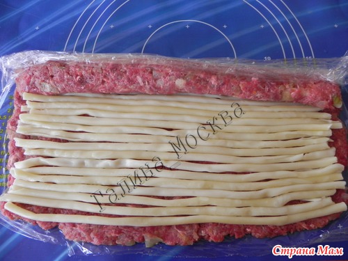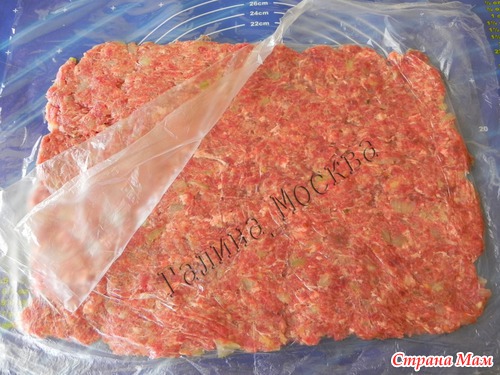 Выложить фарш на пленку и раскатать в прямоугольник. Я раскатывала скалкой между двух разрезанных полиэтиленовых пакетов, помогая формировать прямоугольник руками.
