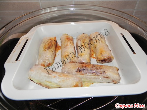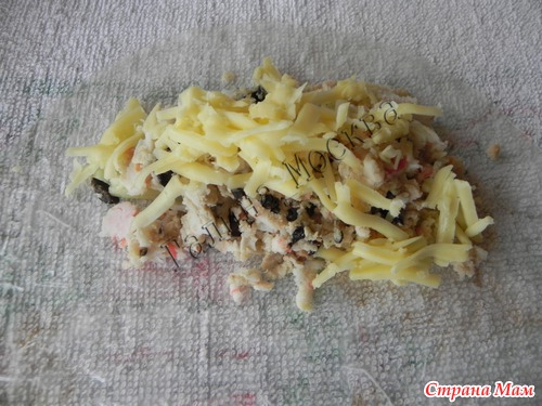 В качестве фарша были вчерашние куриные котлеты, размельченные в блендере. И рыбный рулет, который готовила в ветчиннице.( Готовила из того, что было в холодильнике) Таким образом у меня получилось два варианта: мясной и рыбный. Ну собственно и всё. Начинаем сборку блинчиков.