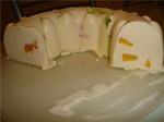 Половину сахара взбиваем со сметаной(или сливками),половину перетираем с творогом, соединяем вместе, вливаем желатин и персики(или др.),заливаем в форму или отдельные формочки.
