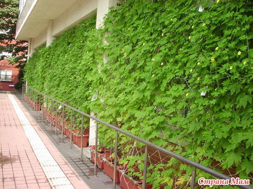 Но посадили мы гойю не для того что бы кушать, а для того что бы сделать живой занавес на окно. Давно хотела попробовать, в этом году наконец-то решилась. Купили сетку, что бы гойя могла по ней тянуться, купили семена. Семена хорошо взошли почти все. Сейчас у меня 6 хороших крепких ростка. Буду стремиться к такому занавесу.