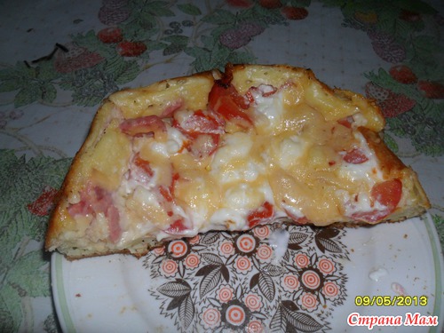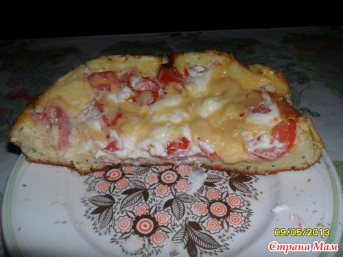 4 cт. л майонеза,4 ст. л сметаны,2 яйца,1/2 ч. л соды гашеной уксусом, соль по вкусу,9 ст. л муки. Все смешать. Вылить в мультяшку смазанную раст. маслом, выложить начинку для пиццы ( у меня колбаса вареная, помидоры, сделать решетку из майонеза и всё обильно посыпать сыром). Режим "ВЫПЕЧКА" на 15 мин. Пекла первый раз, поэтому когда пропикала мультяшка, я чегой-то подумала, вдруг тесто сыроватое, поэтому добавила ещё режим "РЫБА/РИС" 8 мин. ВСЕ...