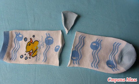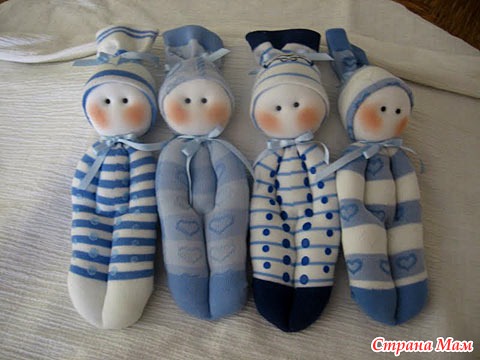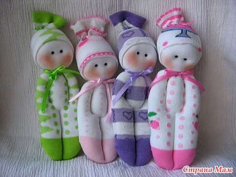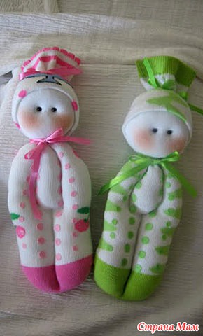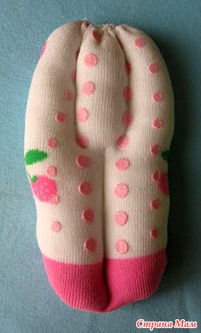 Пришиваем голову к тельцу куклы, из верхней части носка делаем шапочку. Рисуем щечки. Наша куколка готова.