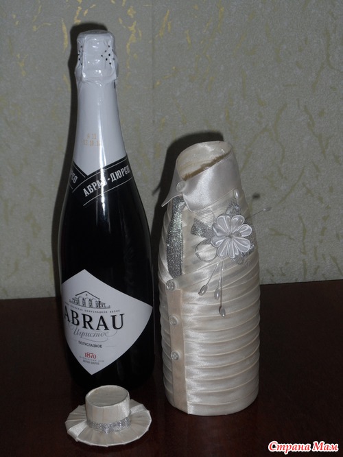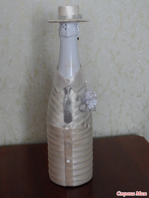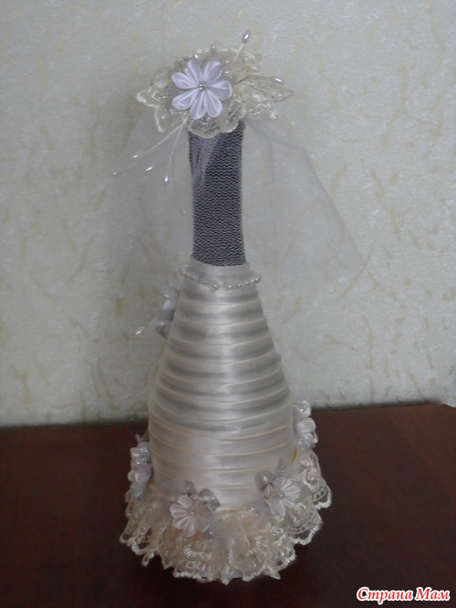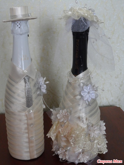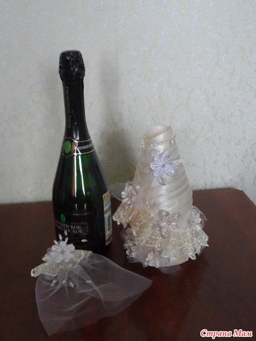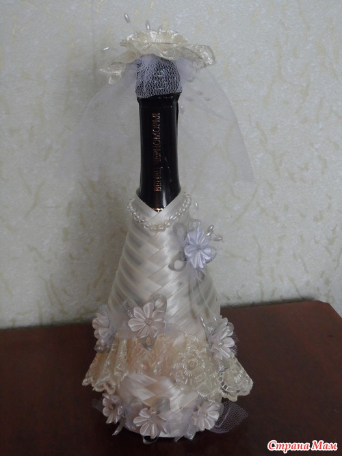 Привет девчонки. Давно ничего не делала, только любовалась Вашими работами. А тут у сотрудницы сын женится, попросила нарядить бутылочки, отказать было неудобно. Приносит бутылки... разные и та что пузатая должна быть невеста, да и нарядить их надо в цвет шампанского. Я недели две ломала голову как сделать и вот, что у меня получилось