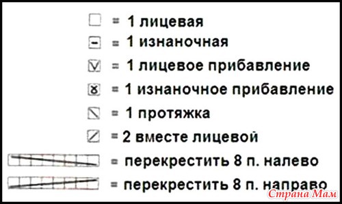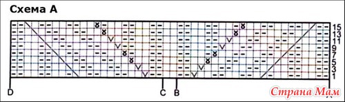 Узор В: см. схему В. В изнаночных рядах, не показанных на схеме, вязать петли по рисунку. Для того чтобы перекрестить 8 п. направо нужно снять 4 п. на вспомогательную спицу за работой, 4 лиц., 4 лиц. со вспомогательной спицы. Для того чтобы перекрестить 8 п. налево нужно снять 4 п. на вспомогательную спицу перед