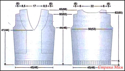 следующих петлях), 2 п. лицевой глади, 2 п. изнаночной глади, 1 кром. петля. Затем повернуть работу, продолжить только правую сторону переда. Для выреза горловины переда перед последними 25 п. выполнять убавления в лицевых рядах: по 1 п. каждые 4 ряда и по 1 п. каждые 2 ряда 8 раз, по 1 п. каждые 4 ряда 9 раз. Для убавления 1 п. выполнять 1 протяжку. На высоте 44 (46) см для проймы закрыть с правого бока 2 (3) п. и продолжать убавления после 2 первых петель ряда по 1 петле каждые 2 ряда 5 раз. Для убавления выполнять 2 петли вместе лицевой. На высоте 60 (63) см для плеча закрыть с правой стороны работы каждые 2 ряда по 4 п. 3 раза (по 5 п. 2 раза, по 4 п. 1 раз). На 25 оставшихся петлях связать 10 рядов и закрыть петли в 3 приема, то есть 9 п. 1 раз и 8 п. 2 раза. Выполнить вторую часть переда в зеркальном отображении.