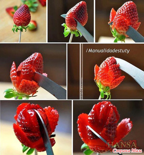 Но это не так уж важно. Важно, что для украшения наших кондитерских шедевров можно эту ягодку взять как украшение. А как вариант предлогаю посмотреть, как ихз клубнички можно сделать цветочек. Это очень просто, а выглядит очень красиво!