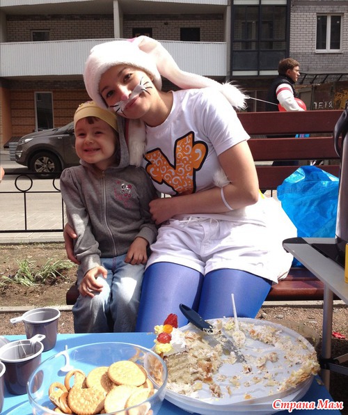 И наконец, настал кульминационный момент: принесли самовар с горячим чаем, соки, конфеты и торт со свечами. Дети сильно оживились, а потом - разбрелись по площадке в сопровождении своих родителей, поедая угощение. Но Ксюха - создание хитропопое, она не мелочится. Дите скромненько подсело к аниматору-Белке (или кто она?) и завела светскую беседу: "Тетя, вы очень красиво накрашены! Вы - Белочка? Вы к нам еще придете? Я песенки еще знаю!".