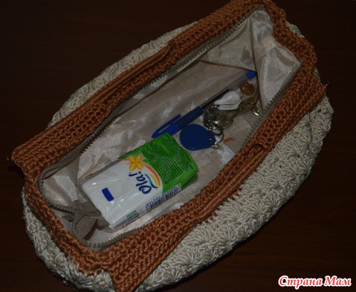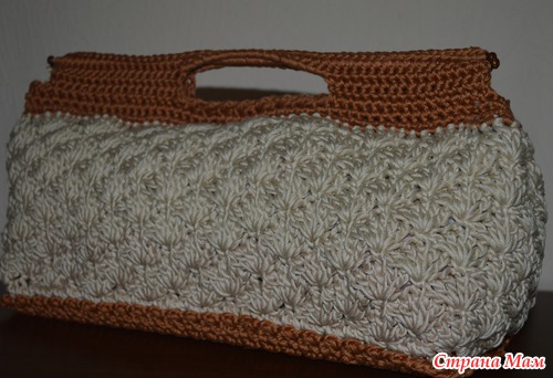 Всем доброго времени суток! Хочу показать вам сумочку, связанную мной для теплого времени года. Связана она из мерс. хлопка 110м на 100гр, на молнии, внутри подклад. Размеры 30х10, высота с ручками 20 см. Уже успела пройти проверку на вместимость при походе в гости: 3 хаггиса, платье, колготки, носки (на 1,5 года), трусы, носки, колготки, тапки (на 3 года) и мои личные вещи (кошелек, ключи, вл. салфетки и т. д.). Планирую еще сделать длинную ручку для удобства.