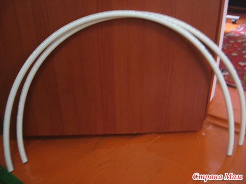 Теперь нужны дуги, муж мне отрезал от обычных труб, остались после того как мы меняли водопровод, продаются такие трубы в строительном магазине и стоя копейки, у нас метр 100 тенге, трубы легко гнуться. Размер смотрите сами, какой высоты вы захотите, одна такая дуга должна быть подлиньше другой, так ставятся друг на друга