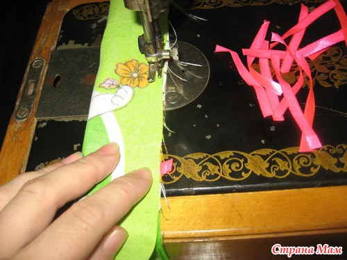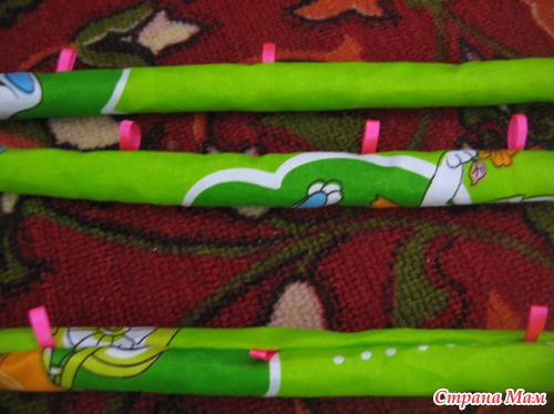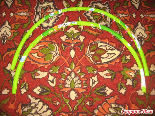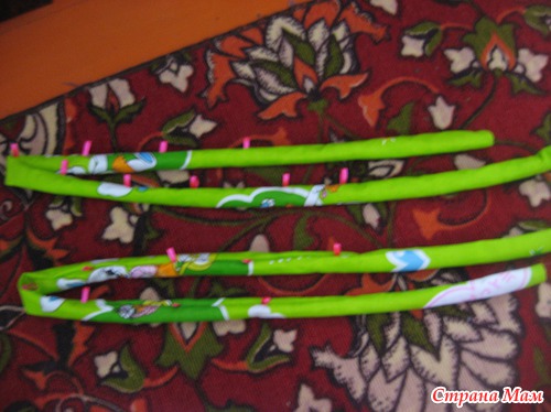 Хотела готовые дуги обшить паралоном, потом синтепоном, промучилась продумывая как и что и решила просто сшить чехлы. Вырезала по длине дуг полосочки, сшила их между собой периодически вставляя сложенные в двое ленточки