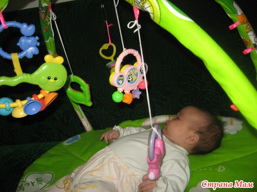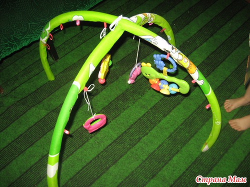 Сверху я завязала дуги ленточкой, игрушки повесила на резиночки-дочка если за них начнет хвататься, то сможет подтянуть к себе