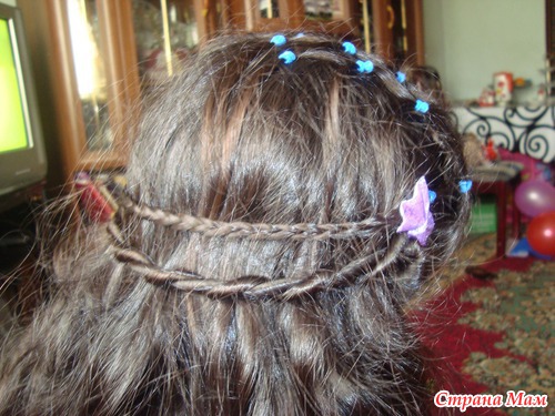 я своей похожим образом "сеточку" на голове делала на выпускной. только не из прядей а косичек. и остальные волосы собирала (жарко было)