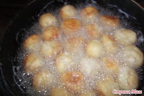 Разогреть масло для фритюра. Мокрой ложкой или руками брать немного массы и формировать маленькие шарики