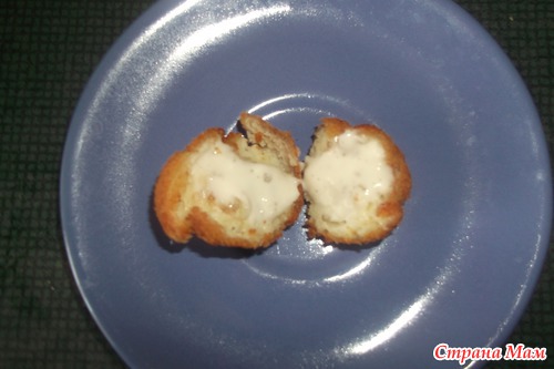 В середине пончика образуется пустота, которую можно наполнить по собственному вкусу. Я попробовала несколько штучек наполнить чесночным соусом