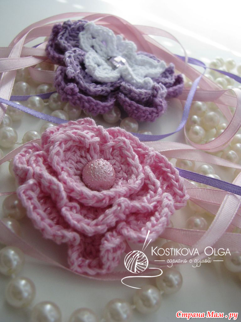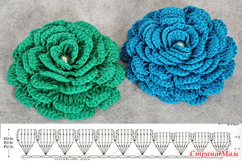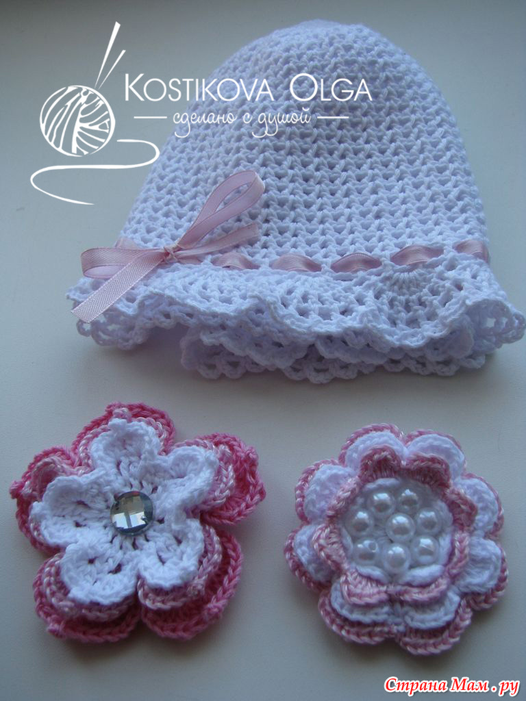 Первая шапочка на окружность 46, а вторая на 52. Поля по одной схемке, только изменила основу. Цветочки съемные, на булавках для броши.