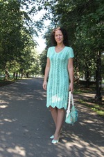Таня пишет - Сейчас только еще раз посмотрела на своё платье и вспомнила, что расклешение не за счет воздушек, а за счет столбиков с накидом (это видно, что внизу их больше, чем в верху). Платье вяжется снизу-вверх. Вырез и окат рукава делала по представленной схеме.