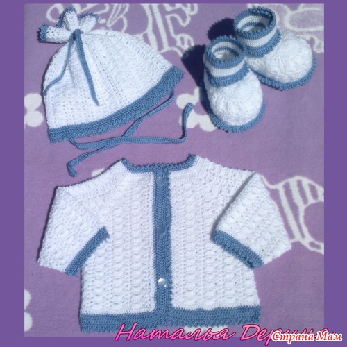 Поставили мне непростую задачку связать комплект на выписку для мальчика, но без всяких рюш и что-бы было нежно и красиво. Вот и пришлось импровизировать от начала и до конца. Надеюсь результат понравится маме и малышу