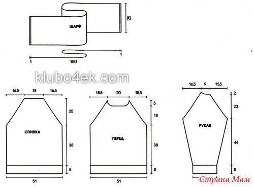 Спинка: набрать 126 п. и связать 4 р. двойной резинкой, далее вязать резинкой 2/2. Через 8 см от наборного края вязать основным узором, равномерно убавив в 1-м р. 19 п. Через 38 см от резинки для скосов реглана закрыть с обеих сторон 1 х 2 п., затем убавлять после 2 первых и перед 2 последними петлями в каждом 2-м р. 33 х 1 п. Через 25 см от начала реглана закрыть оставшиеся 37 п.