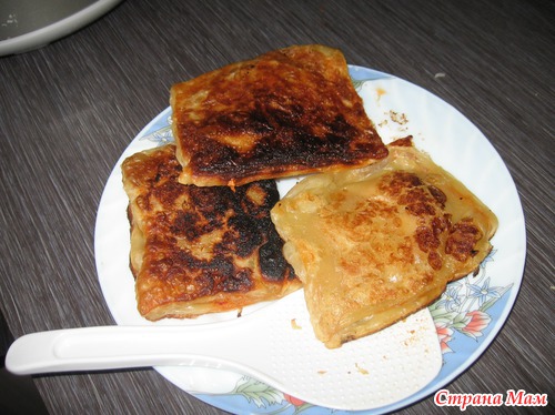 Получилось 8 вот таких "пирожков". 2 положила в мультиварку на дно и поставила на режим выпечки. Минут через 10 смотрю - низ поджарилася. Попыталась перевернуть. Один разошелся по швам. Перевернуть бы не получилось, учитывая глубокую чашу. Оставила как есть. Аккуратно перевернула другой. Еще минут через 5-6 достала тот, что перевернула, другой оставила "дозревать".