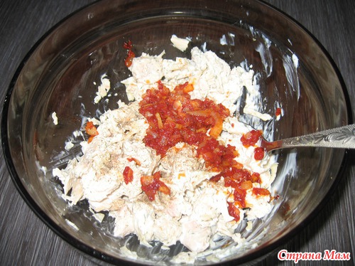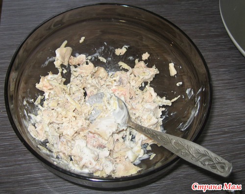 1. сделала начинку: вареная курица, сыр, майонез (домашний), перец.