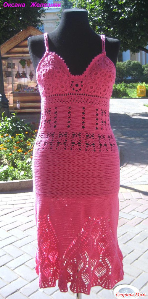 СТРАНА мамочки предоставляю вашему взгляду свой САРАФАН - платье. Связан путём совмещения схем разных узоров по наитию. В лиф вшит х/б подклад. Пряжа семёновская "Кабле" цвет фуксия,100г/430м., расход 4,5 мотка, размер 44-46.