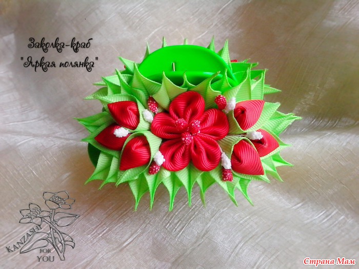 Долго вынашивала идею заколки-краба с такой композицией и вот! Она у меня родилась!!! Пока никто не мешал, села за паяльник и "настрогала" лепесточков остреньких. Добавила тычинок и крупненьких лепестков из репса. Так и родился мой первенец-крабик... Это после полутора лет безуспешных просьб ко мне от заказчиков. Раньше отвечала что-то типа "Я не умею на крабики крепить". Видимо, умею, да еще как