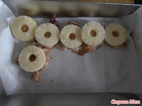 Филе мяса ( можно любого, даже курочку или индейку) нарезаем кусочками по размеру кружочка консервированного ананаса. Отбиваем, солим, перчим.