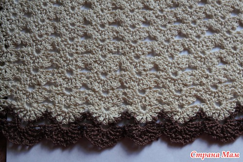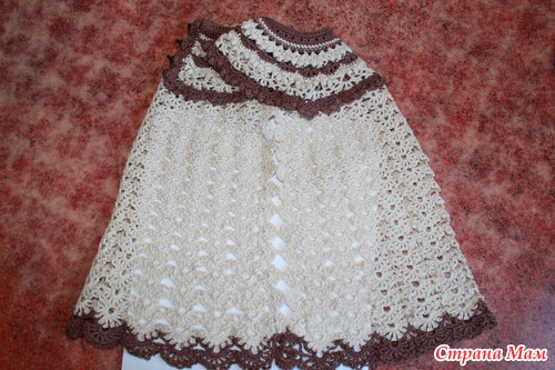 Связав большую часть поняла, что может быть узковато. Распускать не захотелось, решила выкрутиться следующим образом: обвязала обе половинки юбки вот такими столбиками с накидом и соеденила