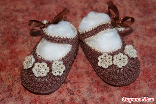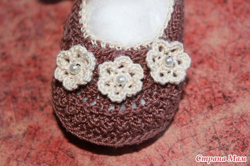 а цветочки просто набрала колечко из 6 петелек, потом связала лепесточки - по три воздушные петли в каждую из шести петель кружочка, а затем обвязала эти три петли то ли 4, то ли пятью столбиками без накида, получились такие вот малюпусики - цветочки, как раз для пинеток