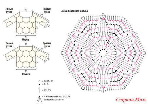 Все мотивы соединить между собой в последнем ряду согласно схеие и выкройке. Линию горловины обвязать по кругу 2-мя р. ст. ‘ с/н. Каждый ряд заканчивать с помощью соед. ст Низ рукавов и низ кофточки обвязать по кругу «рачьим шагом». Ряд закончить с помощью соед. ст.